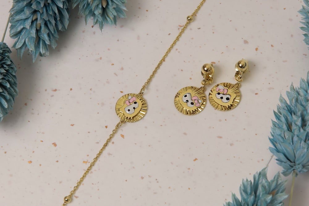 مجموعة اسوارة وحلق كيتي، بوزن إجمالي 4.850 غرام من ذهب عيار 18 قيراط، تجلب البهجة واللعب الطفولي إلى عالم المجوهرات الفاخرة.